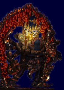 Cast metal statues of Chakrasamvara depict this union particularly well: such a statue appears to depict two figures, but it’s one chunk of Enlightened metal. Look closely; you can’t find where Heruka ends and Vajravarahi begins.